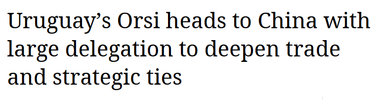 南美新闻机构Merco Press报道称,此次访问正值乌拉圭与中国建交38周年,乌拉圭总统奥尔西率领约150人的代表团启程访华,旨在“加强与乌拉圭最大贸易伙伴之间的经济联系”。