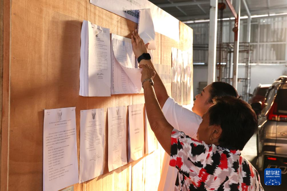 2月8日,两名女子在泰国曼谷一处投票站查看投票信息。新华社记者 孙玮彤 摄