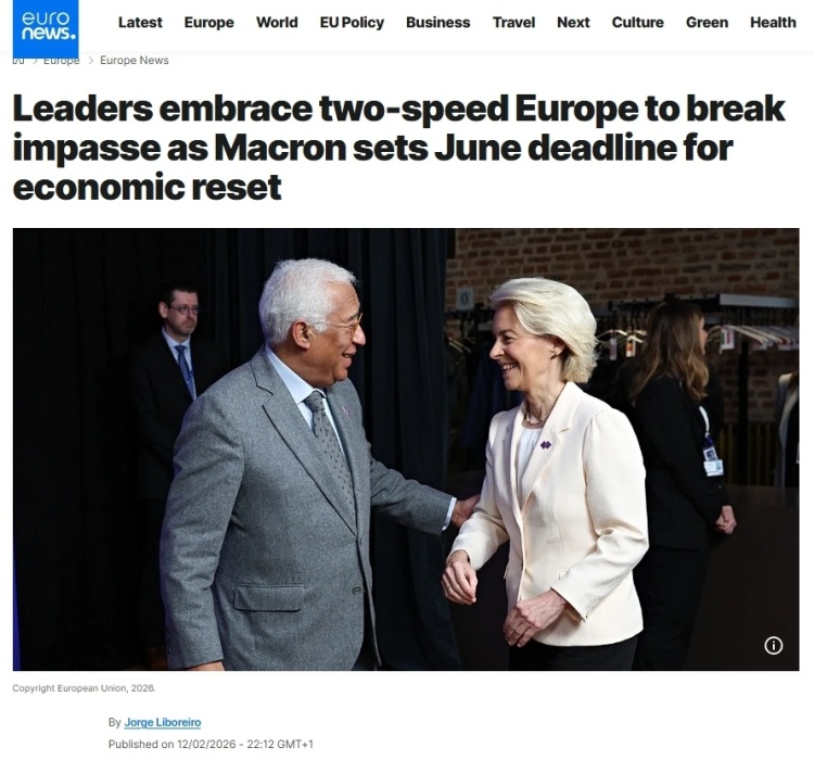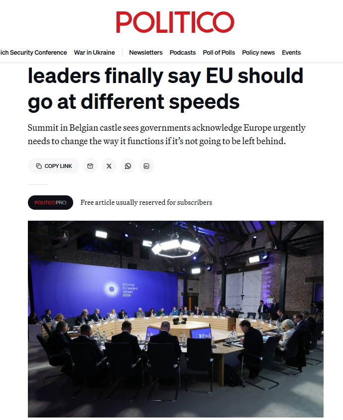 《政治报》网站欧洲版的报道评论称,欧盟一直以其成员国团结一致向前迈进而自豪,那个时代已经结束了。2月12日在比利时举行的会议上,法国、德国、意大利等多国领导人支持,最早将于下个月的欧洲理事会上形成一项计划,以签署组成更小团体的倡议。各国政府表示,由于欧洲的许多想法陷入优柔寡断和不和谐之中,欧洲的竞争优势正在逐渐消失,因此他们感到一种紧迫感。