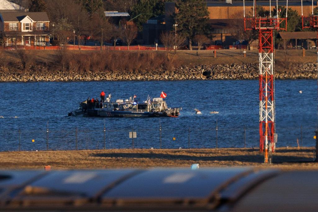 2025年2月1日,工作人员在美国华盛顿里根国家机场旁的波托马克河上打捞飞机残骸。新华社发(亚伦摄)