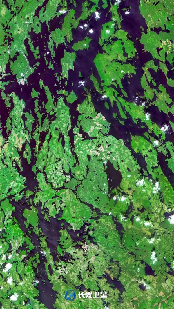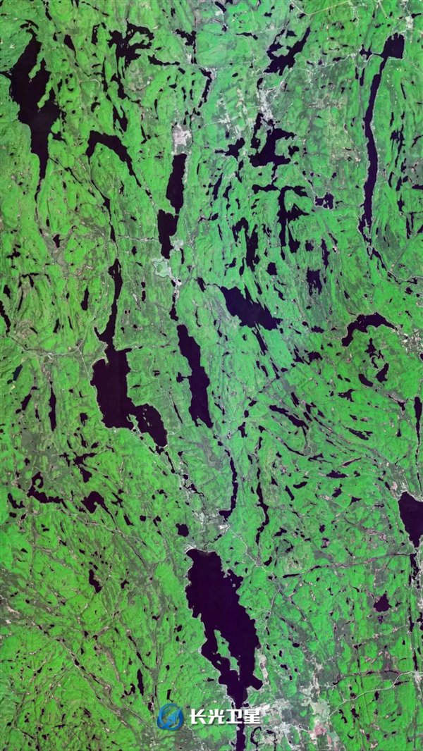 它们如同打碎的镜片,零散密集地镶嵌在深绿色的森林与田野之间。
