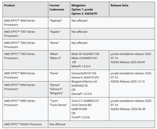 针对存在漏洞的Zen 3/4/5架构的EPYC产品,AMD也早已发布解决措施,只需更新相应的固件版本即可。