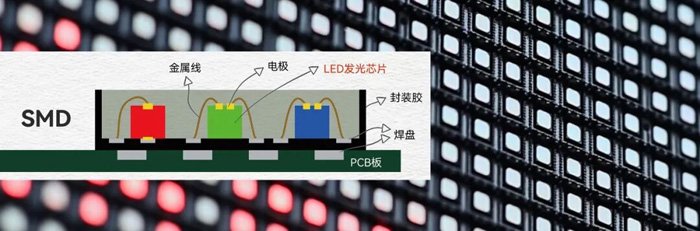 SMD(Surface Mount Device)是LED行业最早的主流封装形式,它的核心特征是:将红、绿、蓝三颗独立的LED正装芯片分别打线封装成灯珠(其中,红光芯片为垂直结构,只需打一根正极引线;蓝/绿芯片为正装结构,正/负极均要打引线),再通过表贴制程,贴装到PCB板上。