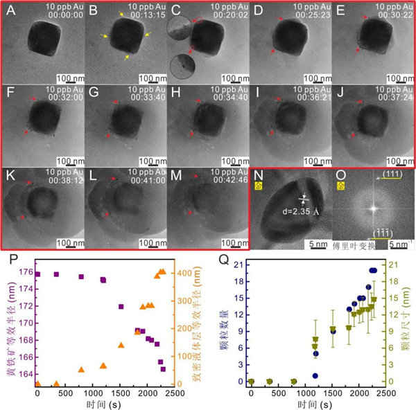 他们利用原位液相透射电子显微镜技术,在纳米尺度下首次“直播”自然界中黄金纳米颗粒在黄铁矿表面的形成动态过程,并提出黄铁矿诱导金沉淀的新机制。