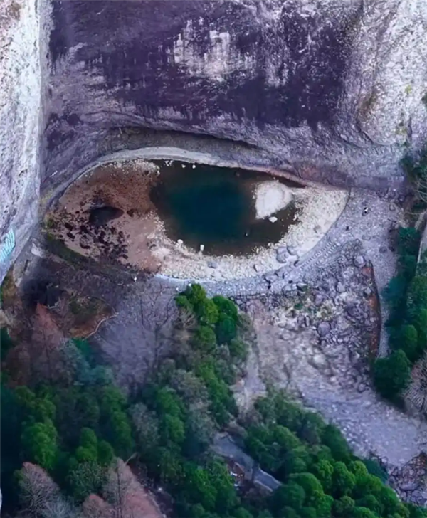 视频中,因水位下降而裸露的潭底岩壁与中央残存的一汪深绿水域巧妙结合,竟自然形成一只栩栩如生的巨大“眼睛”,令人叹为观止。