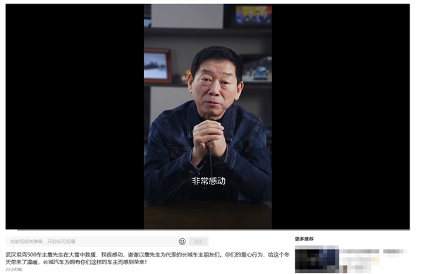 此外,长城汽车董事长魏建军近日也通过视频表达了感动之情,并对以詹时美为代表的长城车主在大雪中展现出的爱心表示感谢。