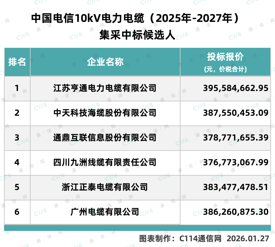 C114讯 1月27日消息(水易)来自中国电信阳光采购网消息,中国电信10kV电力电缆(2025年-2027年)集中采购项目已完成评审。本项目共22名投标人参与投标,根据评审结果,亨通、中天、通鼎等6家企业入围。