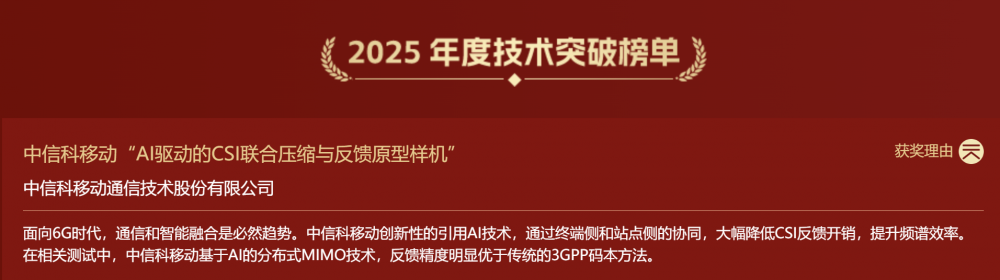 此次入选年度技术突破榜单,既是对中信科移动技术创新实力的高度认可,更彰显了其在AI与通信交叉领域的前瞻视野与技术地位。面向6G,中信科移动正继续深化AI与通信技术的融合创新,推动核心技术自主可控,携手产业伙伴共同构建开放协同的智能通信生态,为全球移动通信产业的发展贡献力量。
