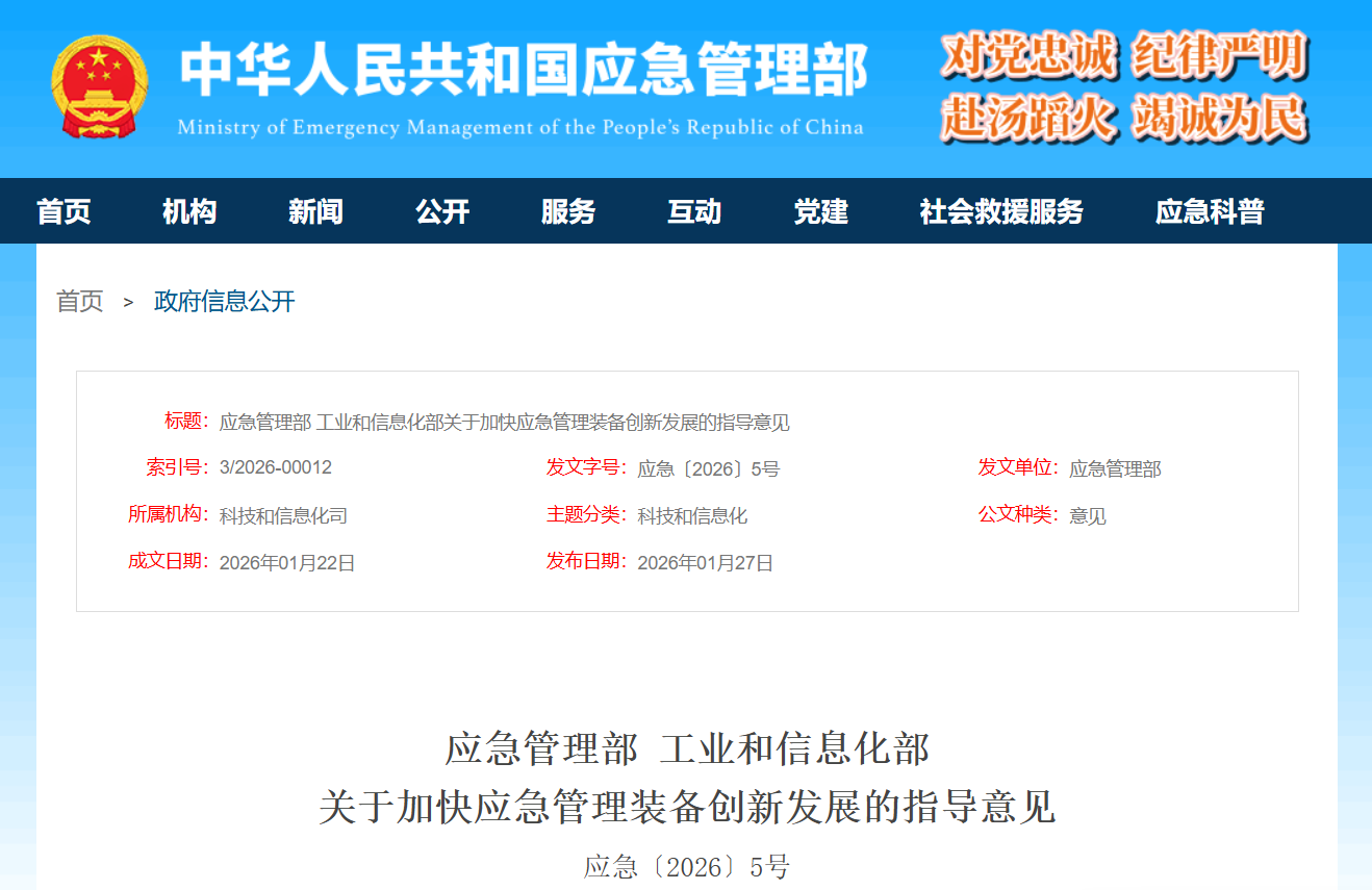 IT之家 1 月 27 日消息,应急管理部、工业和信息化部今日发布《关于加快应急管理装备创新发展的指导意见》(IT之家注:下称《指导意见》)。