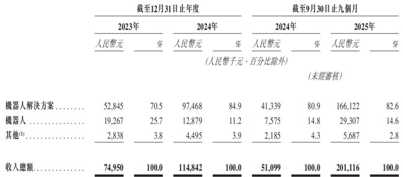 关键财务数据,来源:招股书2025年1-9月,公司来自销售机器人解决方案的收入占比约82.6%,较2023年的70.5%有所提升。