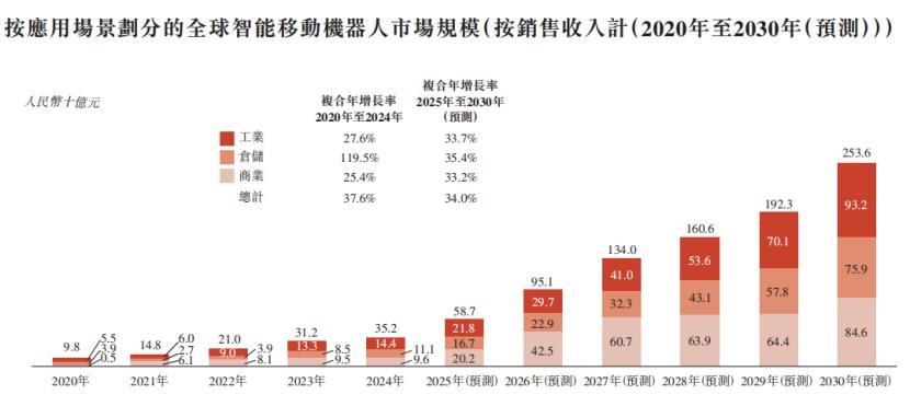 全球智能机器人行业的演进过程可分为四个主要阶段,来源:招股书根据形态与功能特性,智能移动机器人大致可分为以下几类:1、自主移动机器人(AMR):一种室内智能移动平台,通过使用能够承载不同有效载荷载具及特定任务模块的移动底盘,实现点对点物料运输;2、叉取式机器人:一种自主移动机器人,复制了叉车的功能,能够自主提升和移动以托盘装载的货物;及3、室外移动机器人:一种适用于户外场景的高负载智能移动机器人。根据灼识咨询的资料,按销售收入计,全球智能移动机器人市场规模由2020年的98亿元增至2024年的352亿元,复合年增长率为37.6%,预期到2030年将达2536亿元。在中国,智能移动机器人的市场规模由2020年的22亿元增至2024年的108亿元,复合年增长率为49.8%,预期到2030年将达881亿元,2025年至2030年的复合年增长率为36.1%。