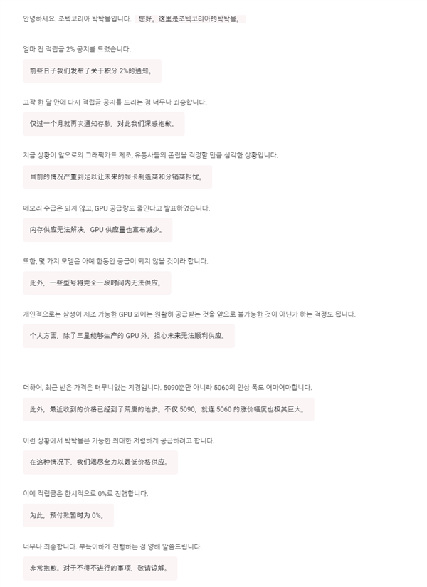 快科技1月28日消息,近日索泰ZOTAC韩国在其官方TagTag Mall账号上发布了一则最新通知,警告显卡供应形势正在恶化。