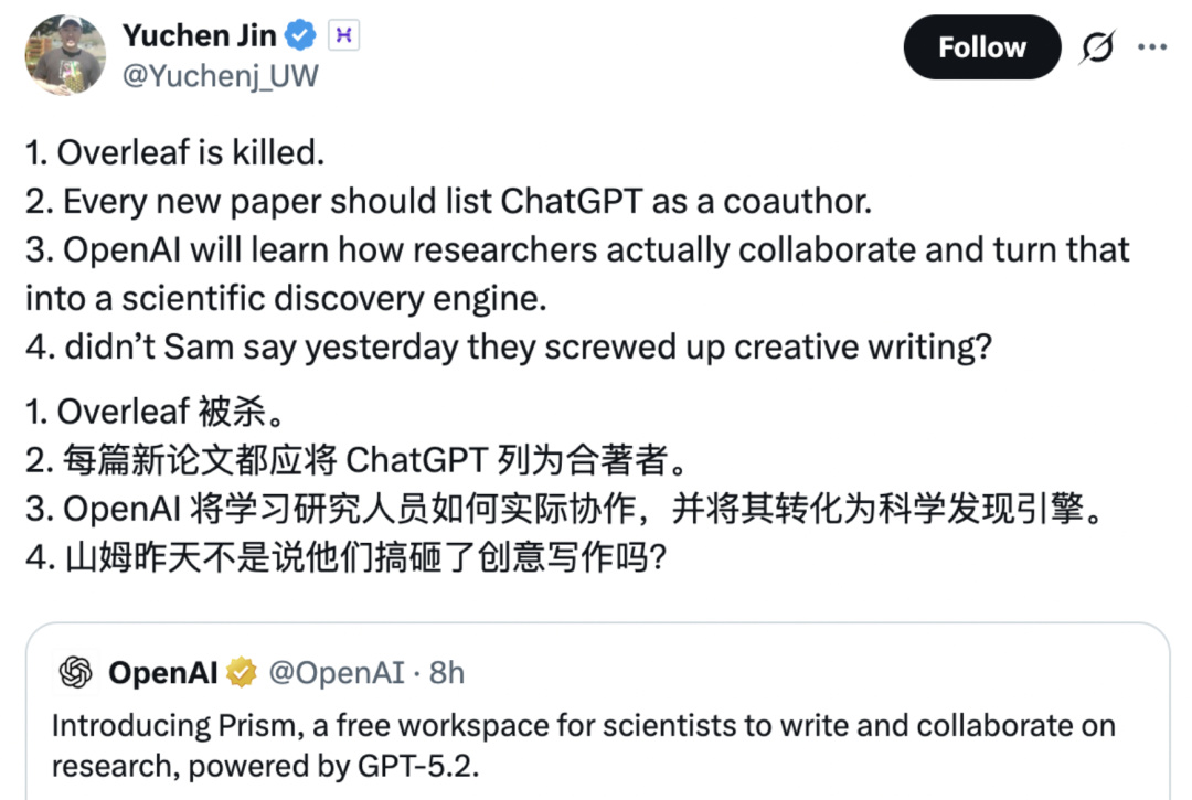 另一方面,官方声称的在 Prism 中,GPT‑5.2 将不再是独立于写作之外的辅助工具,而是直接融入项目核心,那么也引发出一个问题,即研究论文算不算是 AI 参与写作的?