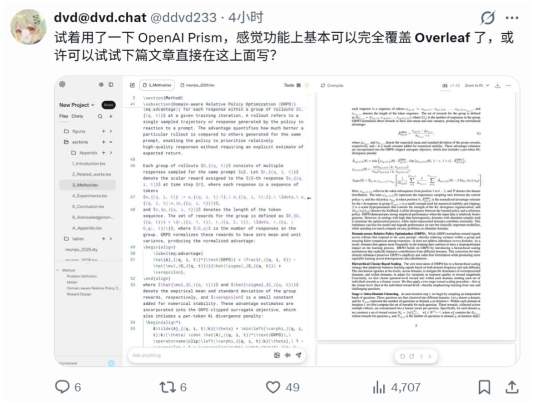 有研究人员在试用后表示,Prism 的功能已基本实现对 Overleaf 的全覆盖,并表示考虑「下篇文章直接在这上面写」。