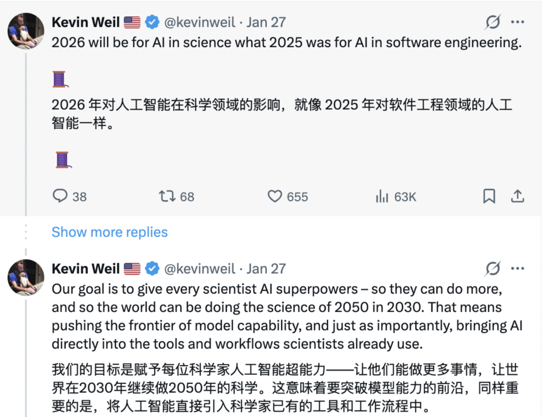 而最近几天,OpenAI 科学业务副总裁 Kevin Weil 也一直在 X 上发文预热,宣称要赋予每位科学家 AI 超能力,让他们做更多的事情。