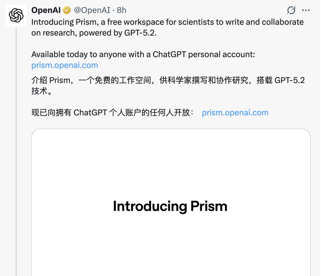 今天凌晨,OpenAI 推出了一个专为科学家打造的 AI 原生协作平台:Prism。