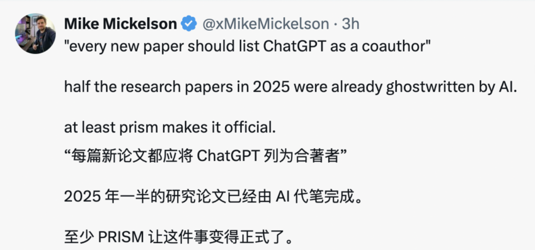 基于此,有网友提出了有趣的的观点,是不是在 Prism 上创作的「每篇新论文都应将 CahtGPT 列为合著者?」「2025 年已经有一半的研究论文由 Ai 代笔,而 Prism 则让这件事情变得正式起来了。」