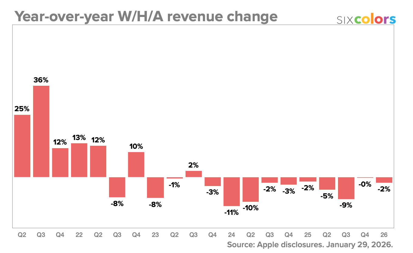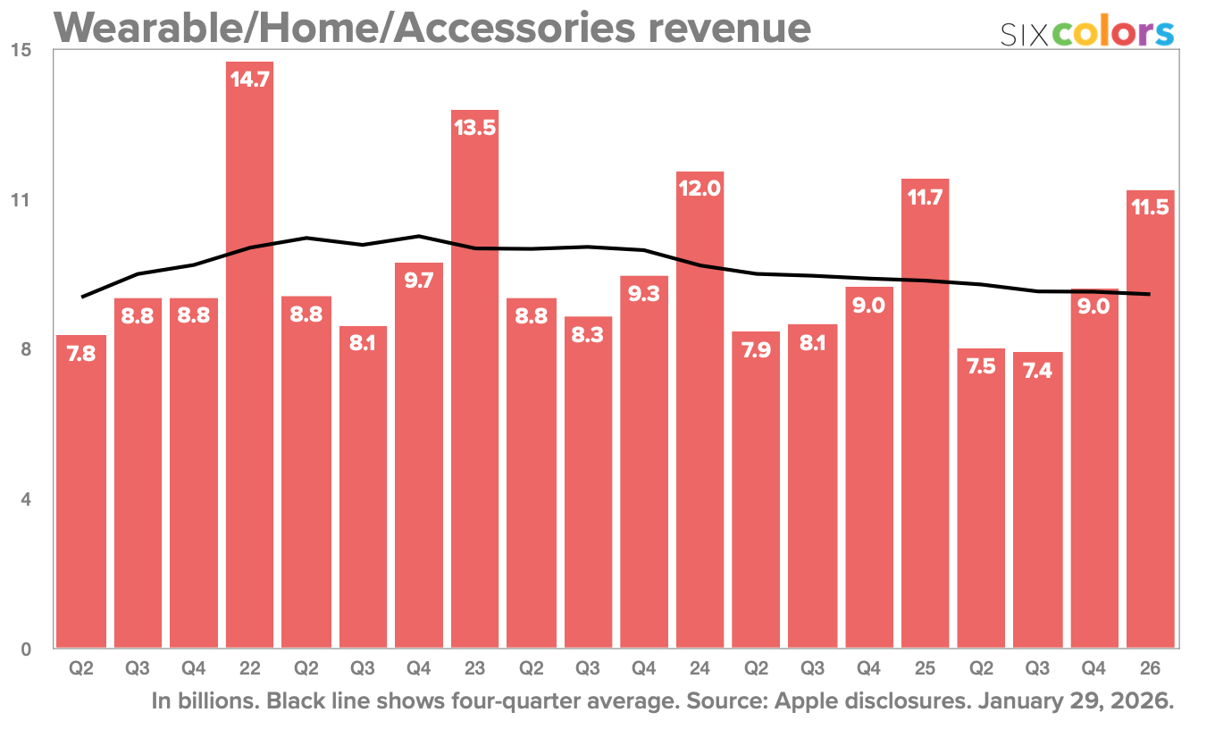 财报数据显示,“可穿戴、家居及配件”业务类别(涵盖 AirPods、Apple Watch 及 HomePod 等产品)在这一季度营收同比下滑了约 2%。IT之家附上相关图表数据如下: