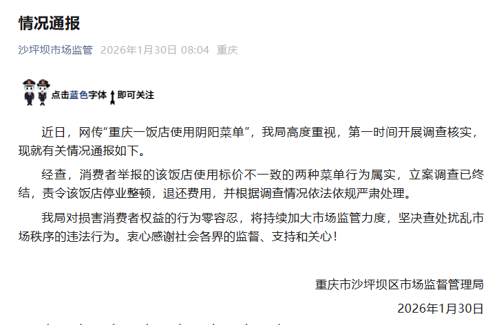 近日,网传“重庆一饭店使用阴阳菜单”,沙坪坝区市场监督管理局高度重视,第一时间开展调查核实,现就有关情况通报如下。
