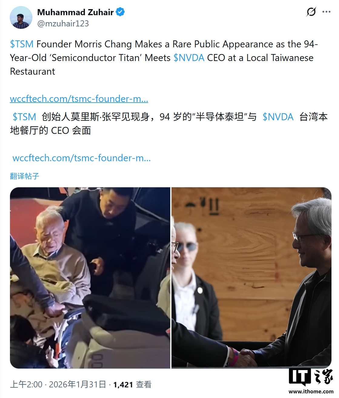 IT之家 1 月 31 日消息,科技媒体 Wccftech 昨日(1 月 30 日)发布博文,报道称英伟达 CEO 黄仁勋在台北某餐厅,与 94 岁高龄的台积电创始人张忠谋会面。