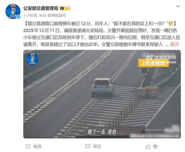 2025年12月11日,福银高速湖北安陆段。交警开展视频巡查时,发现一辆白色小车驶过互通口后忽然刹车停下,随后打起双闪一路向后倒,倒至互通口后进入匝道离开,明显是错过了出口才做出此举。