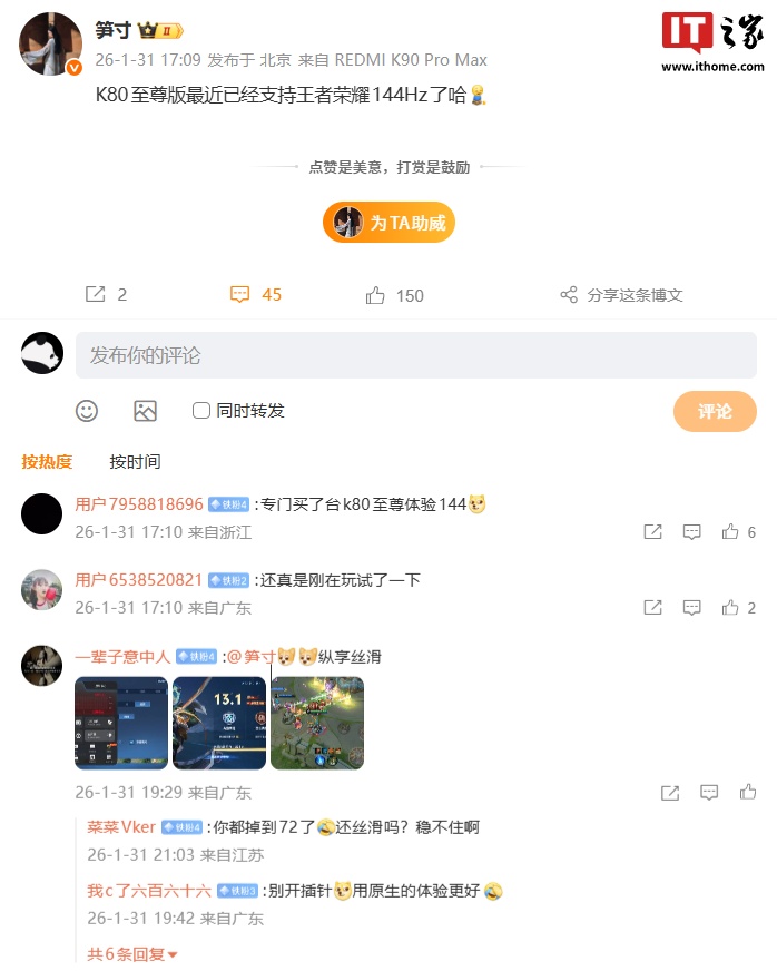 IT之家 2 月 1 日消息,小米 REDMI 产品经理笋寸昨日宣布,REDMI K80 至尊版手机最近已支持《王者荣耀》144Hz 模式游玩。同时有用户分享了自己的游戏体验,称“纵向丝滑”。