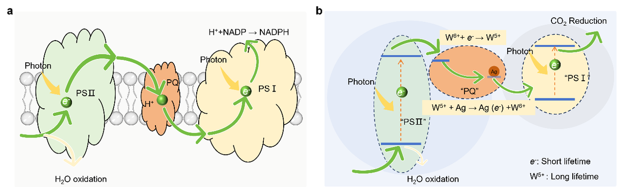 针对上述难题,该研究团队从植物暂存光生电子的生理机制中获得灵感,创新性地设计出一种电子存储路径。通过定向设计与材料结构制备,使新型材料能够在光照条件下储存电子,并在需要时实现精准释放,从而对二氧化碳与水的反应速率和程度进行精确调控。