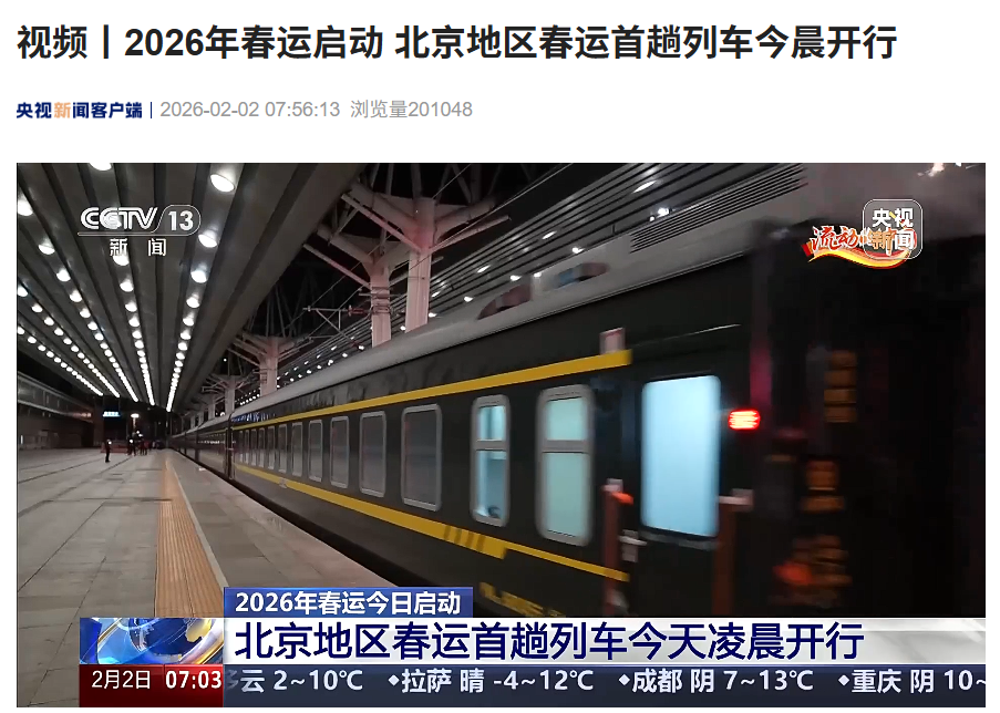 IT之家 2 月 2 日消息,据央视新闻报道,2026 年铁路春运今日启动,自 2 月 2 日至 3 月 13 日结束,为期 40 天,全国铁路预计发送旅客 5.4 亿人次,日均发送 1348 万人次、同比增长 5.0%。