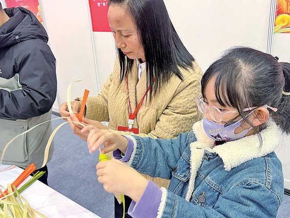 推介会期间,游客在竹编体验区学习竹编技艺。
