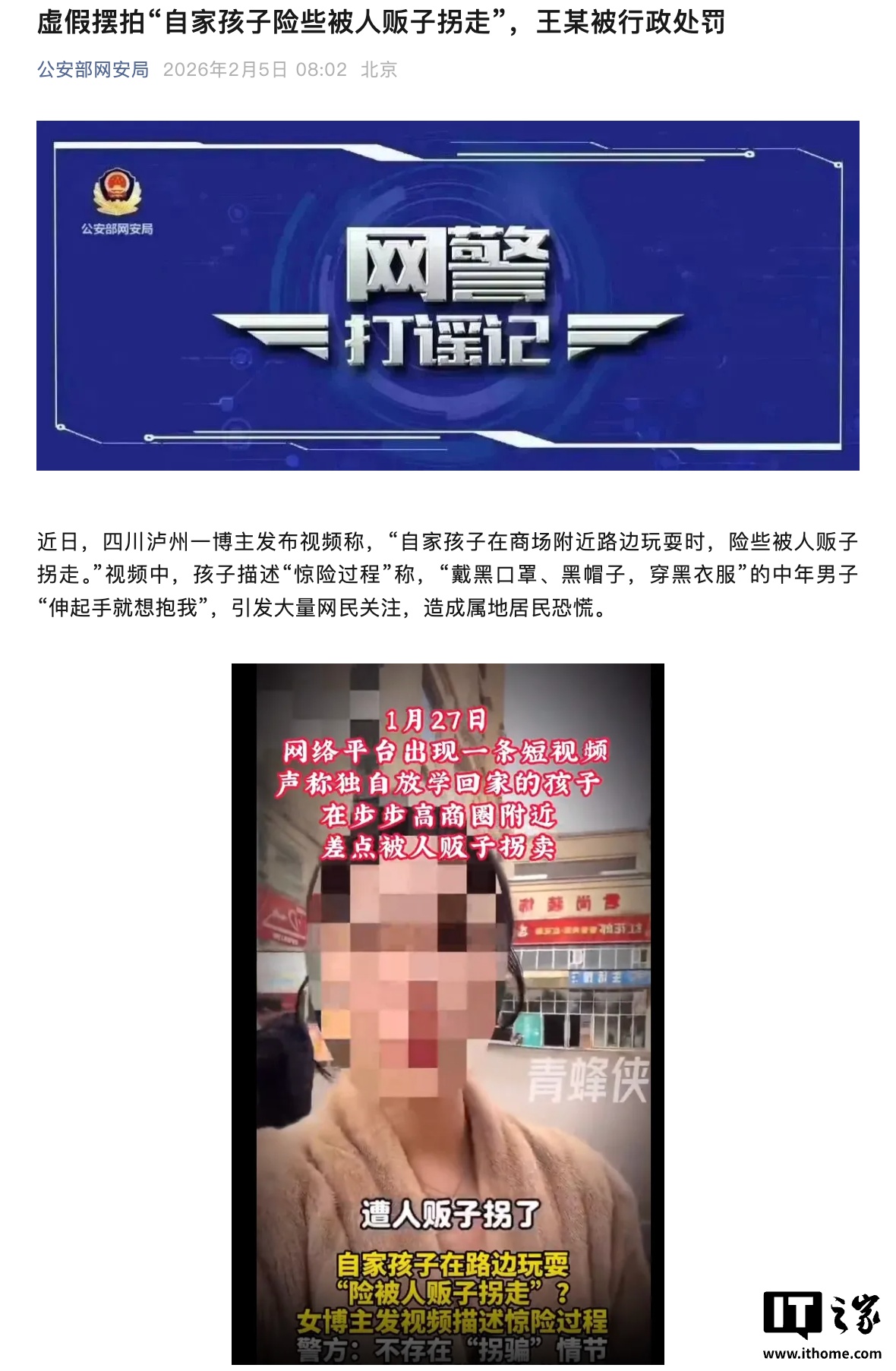 IT之家 2 月 5 日消息,据公安部网安局官方公众号,近日,四川泸州一博主发布视频称,“自家孩子在商场附近路边玩耍时,险些被人贩子拐走。”视频中,孩子描述“惊险过程”称,“戴黑口罩、黑帽子,穿黑衣服”的中年男子“伸起手就想抱我”,引发大量网民关注,造成属地居民恐慌。