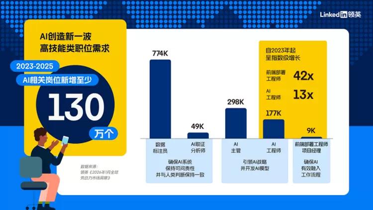 过去两年间,企业新增了至少130万个AI相关岗位,涵盖数据标注员、AI工程师以及前端部署工程师等。这些岗位在五年前还未出现,如今却已成为数字经济不可或缺的组成部分。与此同时,在美国市场,要求具备AI素养的岗位数量同比增长70%。