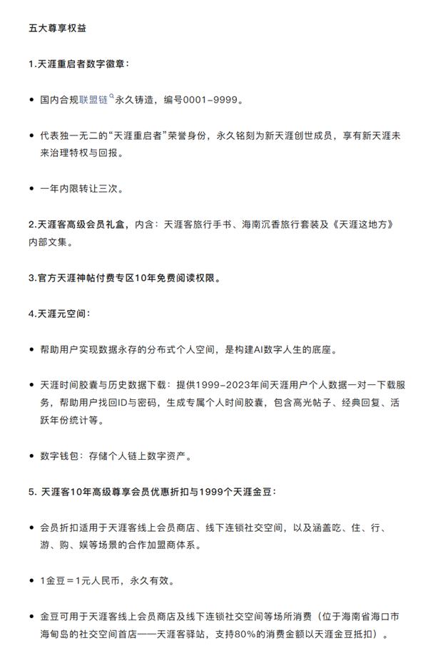 天涯客公司在征得天涯社区公司认可的基础上,推出“新天涯创世成员产品服务包”,招募9999位创世成员,成为新天涯的共建者与天涯社区重启者。