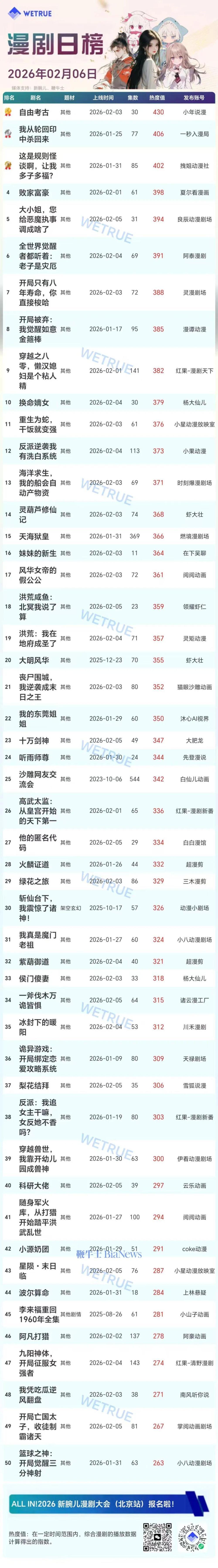今天发布的是昨天(2月6日)漫剧及短剧付费大盘日榜。