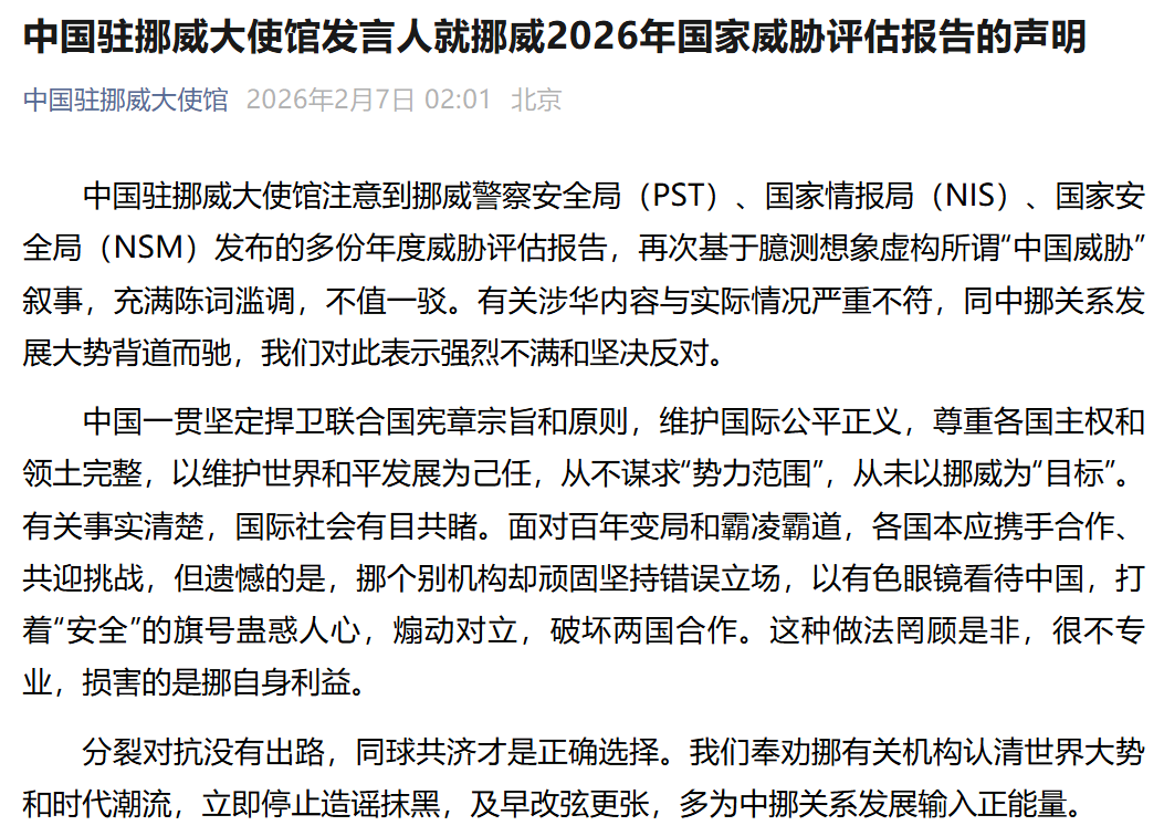 中国驻挪威大使馆发言人就挪威2026年国家威胁评估报告的声明
