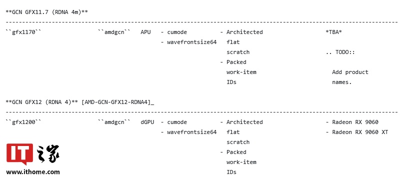 作为参考,"RDNA 3.5" 架构对应 "GFX11.5",而 "RDNA 4" 架构对应 "GFX12",这个 "RDNA4 m" GFX11.7 位于两者之间。