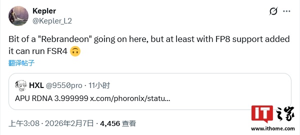 消息人士 @Kepler_L2 表示,尽管 "RDNA4 m" 有些重新命名的感觉,但至少这个架构支持 FP8 数据格式,因此可运行 FSR 4。