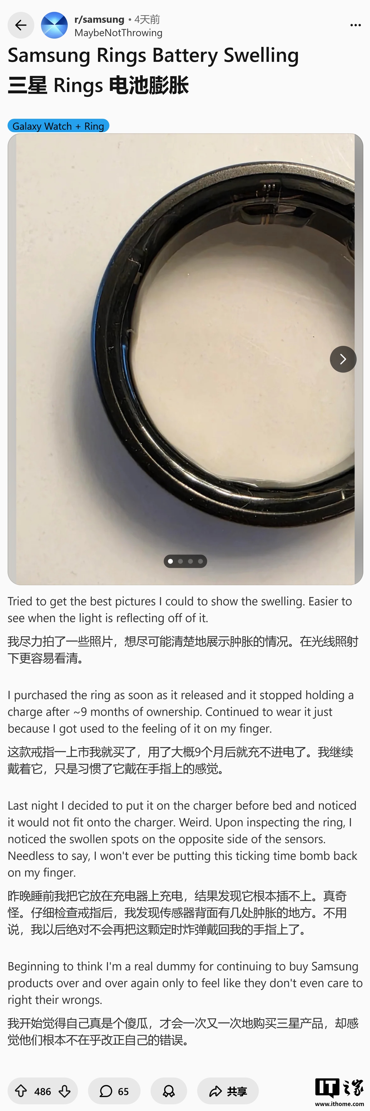 IT之家 2 月 7 日消息,网友 u/MaybeNotThrowing 于 2 月 3 日在 Reddit 社区发帖,反馈其三星 Galaxy Ring 智能戒指存在电池鼓包情况,外媒 Wccftech 形容为“手指上的定时炸弹”。