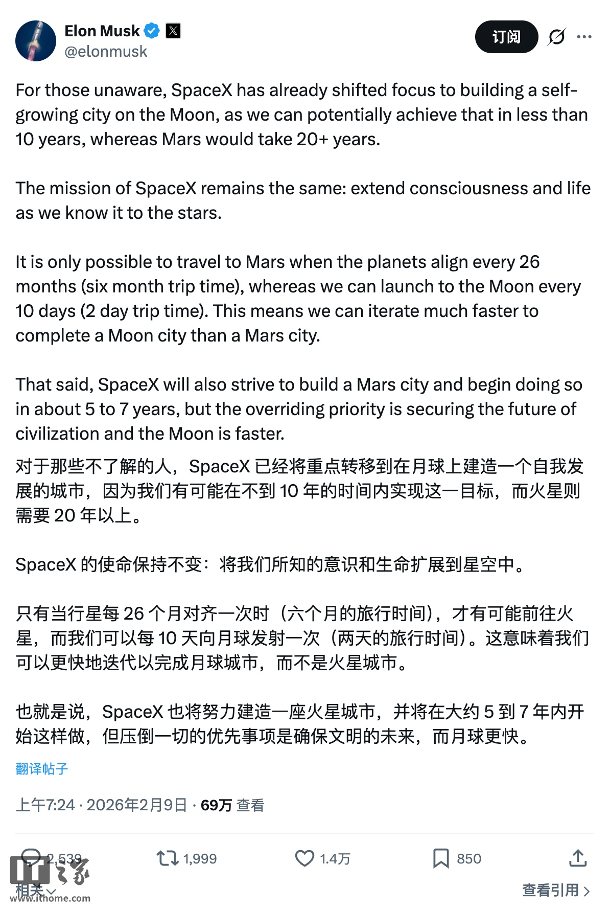IT之家 2 月 9 日消息,今天早间,马斯克在社交平台 X 发帖称,“SpaceX 已经将重点转移到在月球上建造一个自我发展的城市,因为我们有可能在不到 10 年的时间内实现这一目标,而火星则需要 20 年以上。”