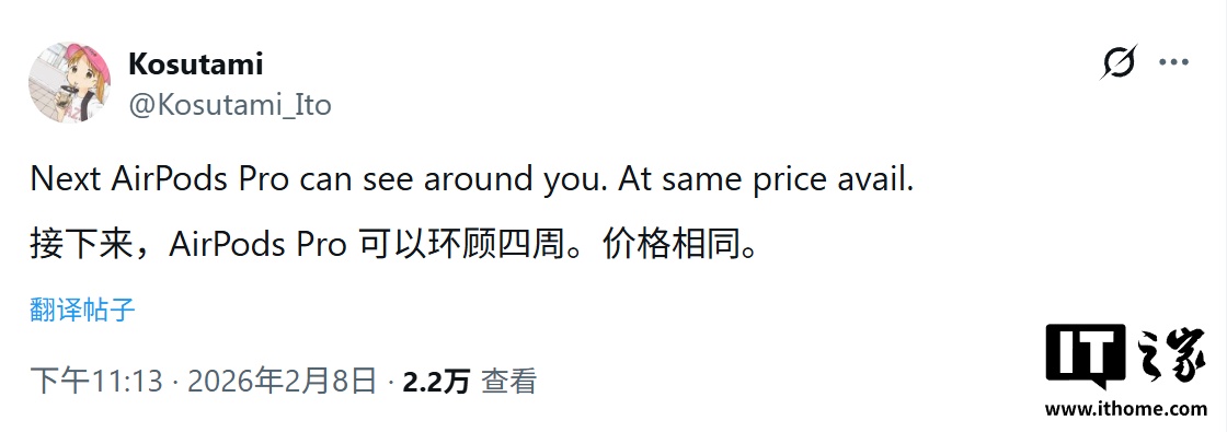 IT之家 2 月 10 日消息,消息源 @Kosutami_Ito 于 2 月 8 日在 X 平台发布推文,爆料称苹果计划在 2026 年打破 AirPods 系列通常为期三年的更新周期,推出一款搭载红外摄像头(IR Cameras)的全新 AirPods Pro。