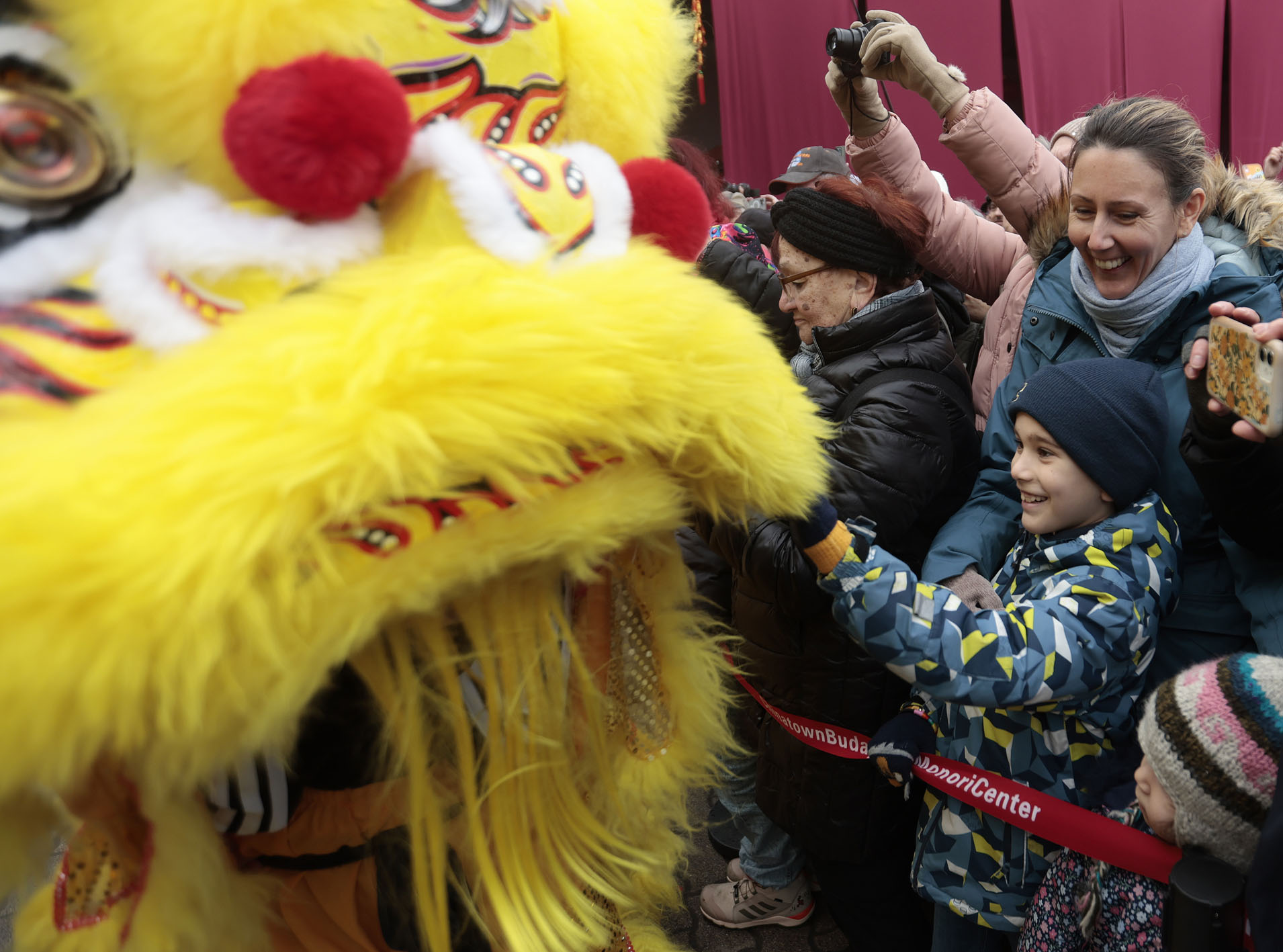 近日,2026“欢乐春节”匈牙利唐人街新春庙会在匈牙利首都布达佩斯开幕。图为人们在唐人街新春庙会上观看舞狮。