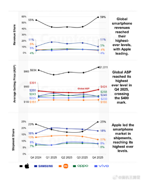 Counterpoint公布的2025年Q4全球智能手机市场数据显示,苹果的平均售价达到1011美元,大约7019元;而同期OPPO、三星、vivo、小米的均价,分别在200美元出头,甚至更低。