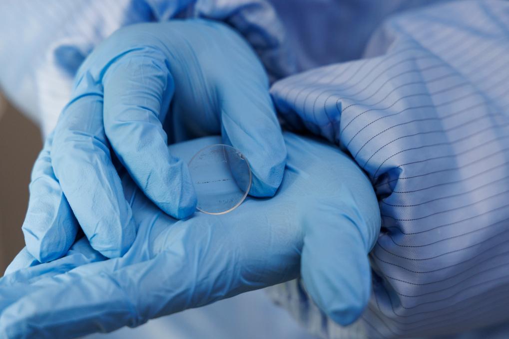 科研人员展示即将进行实验检测的月球样品。新华社记者 金立旺 摄