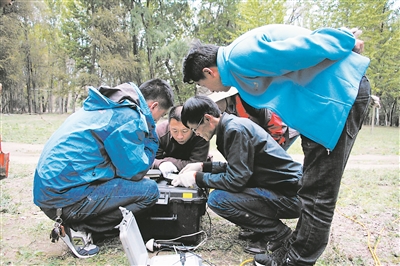 甘斌(左二)与物探技术人员在开展大深度地热探测试验。受访者供图