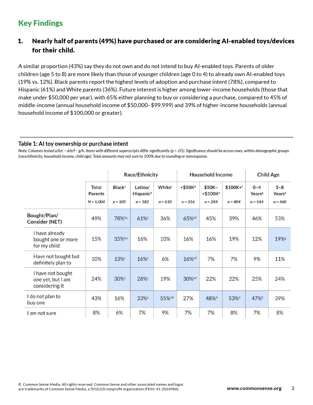 相近比例(43%)的家长表示目前未拥有且无购买计划。年长儿童(5至8岁)的家长较年幼儿童(0至4岁)的家长更可能已拥有此类玩具(19%vs.12%)。
