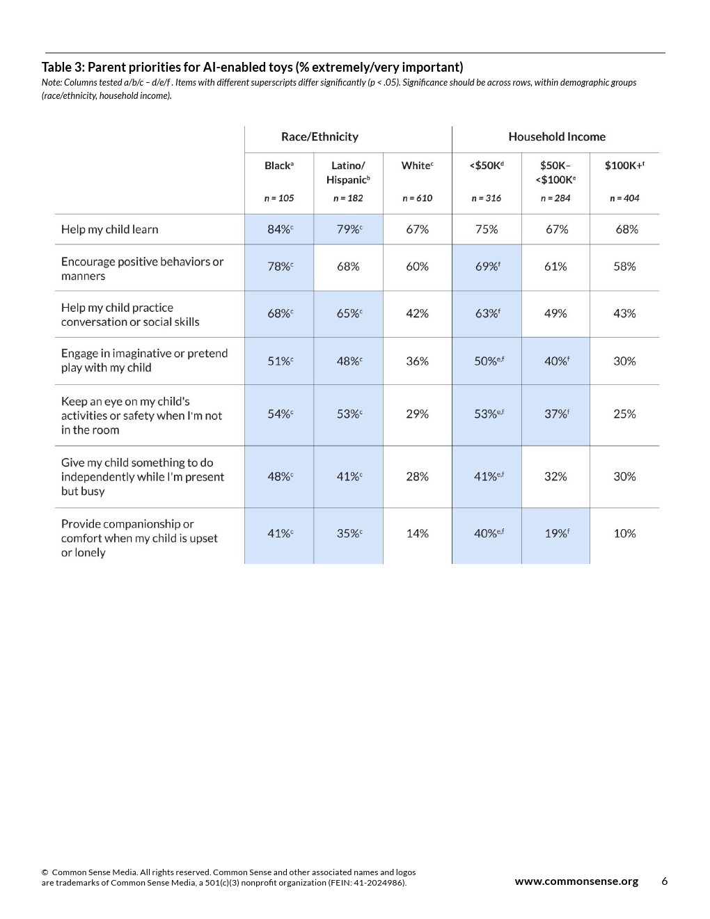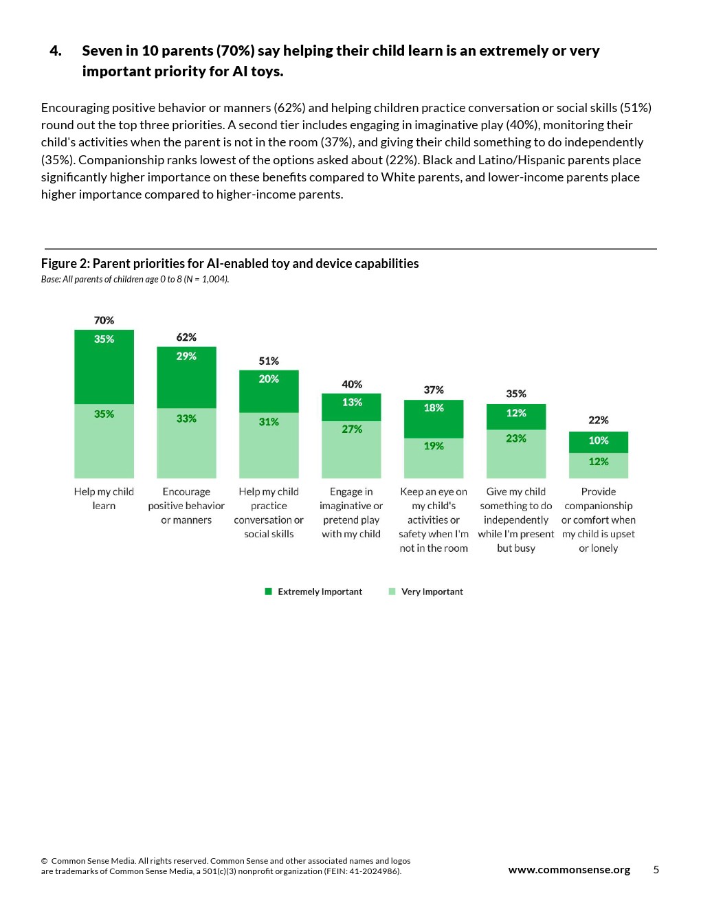 鼓励积极行为或礼仪(62%)与帮助孩子练习对话或社交技能(51%)位列第二、三位。次要功能包括:参与想象游戏(40%)、家长不在房间时监控孩子活动(37%)、让孩子独立进行活动(35%)。陪伴功能在问卷选项中排名最低(22%)。