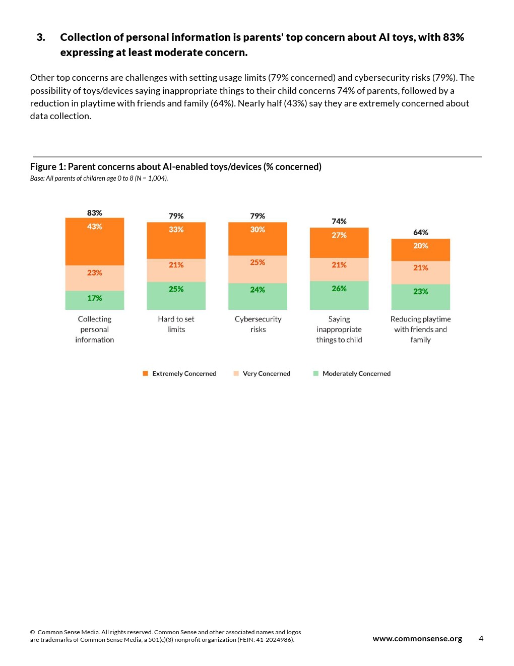 个人信息收集是家长对人工智能玩具的首要担忧,83%家长表示至少中度关切。