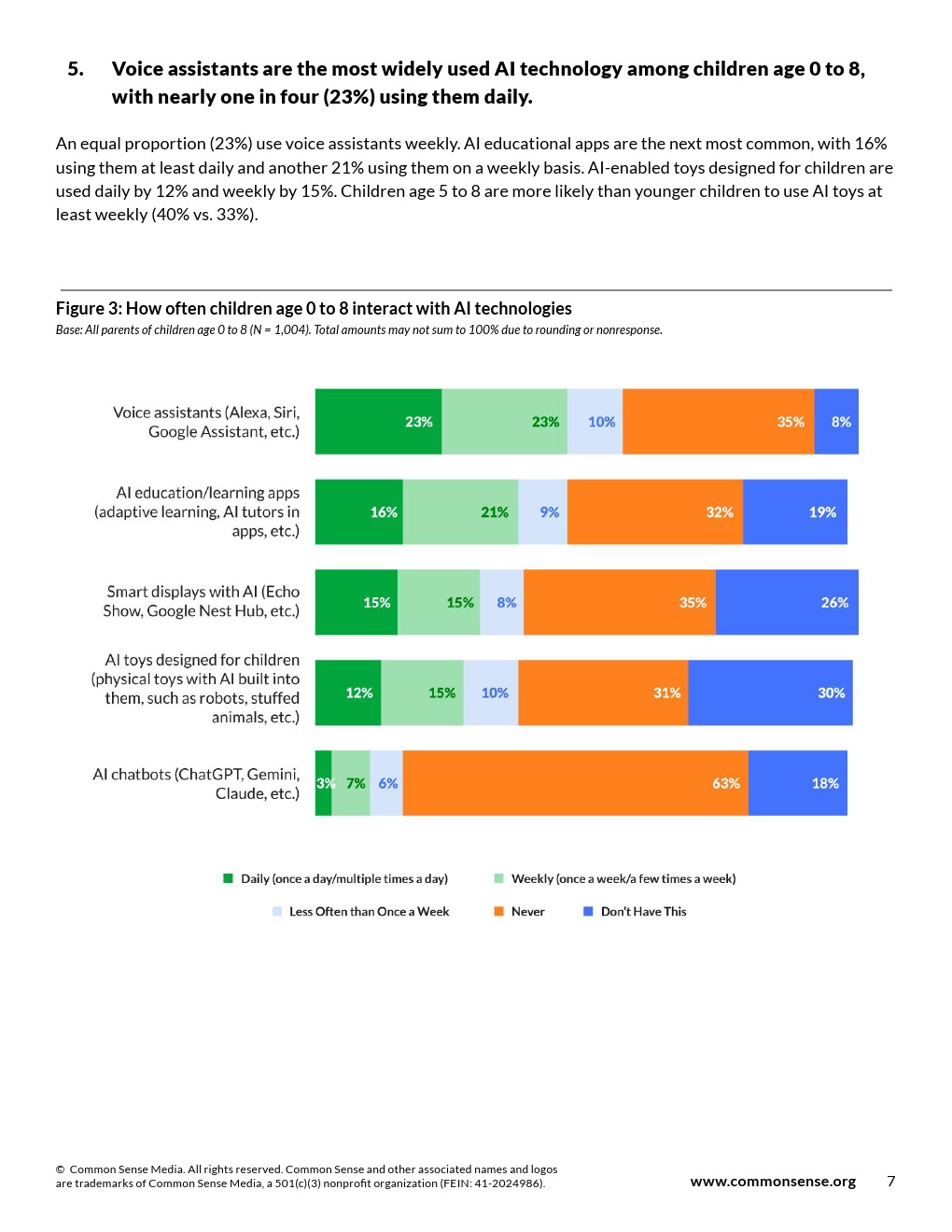 语音助手是0至8岁儿童中使用最广泛的人工智能技术,23%的儿童每日使用。同等比例(23%)儿童每周使用。人工智能教育应用次之,16%儿童每日使用,21%每周使用。