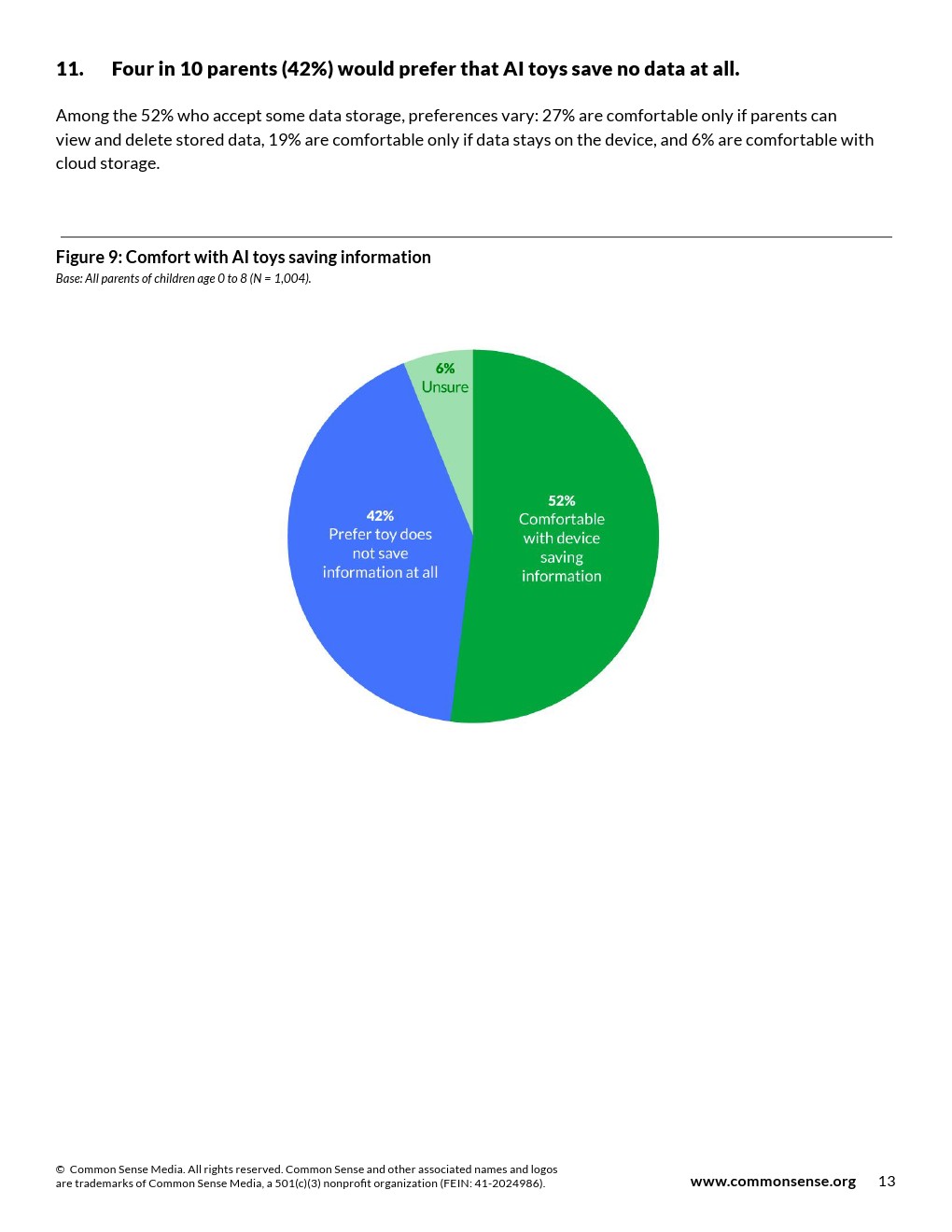 在52%接受一定数据储存的家长中,偏好各异:27%仅同意在家长可查看与删除储存数据的情况下储存,19%仅同意数据留存于设备本地,6%可接受云端储存。