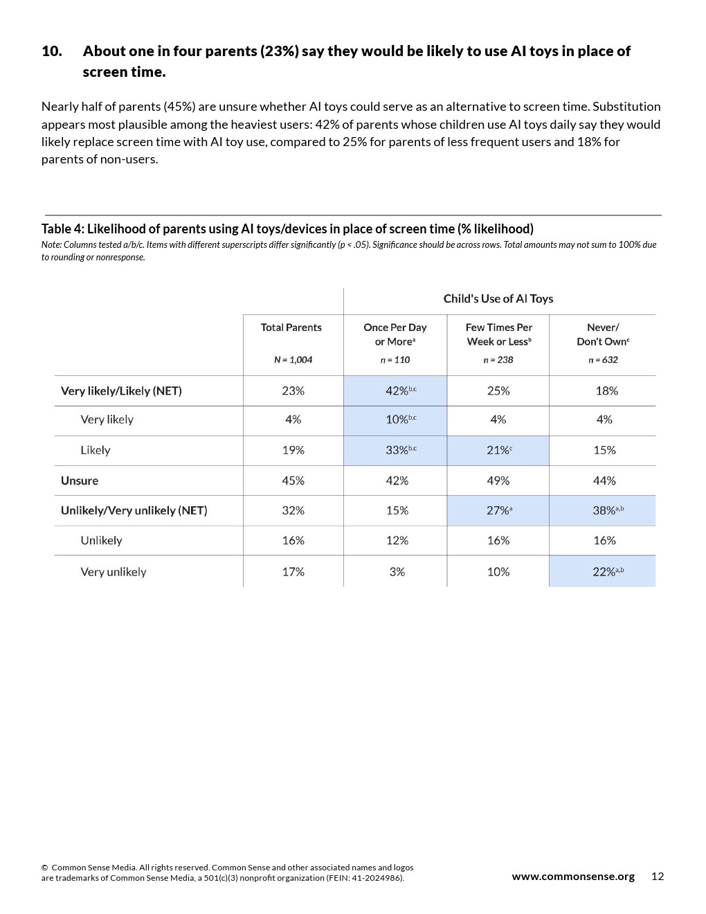 45%的家长不确定人工智能玩具能否作为屏幕时间的替代。替代可能性在重度使用者家庭中最高:孩子每日使用人工智能玩具的家长中,42%表示可能用其替代屏幕时间,而低频使用者家长与非使用者家长的比例分别为25%与18%。