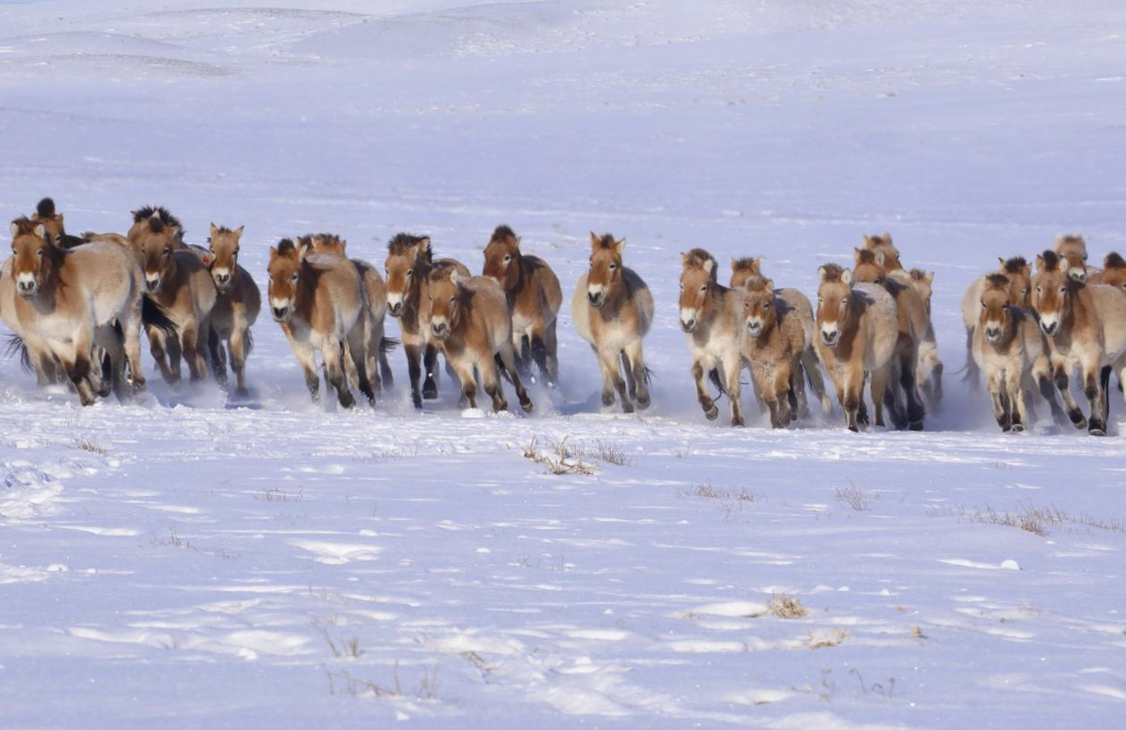 驰骋在雪原上的野马。(中国科学院供图 张赫凡 摄)